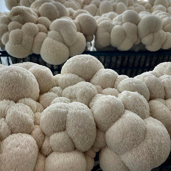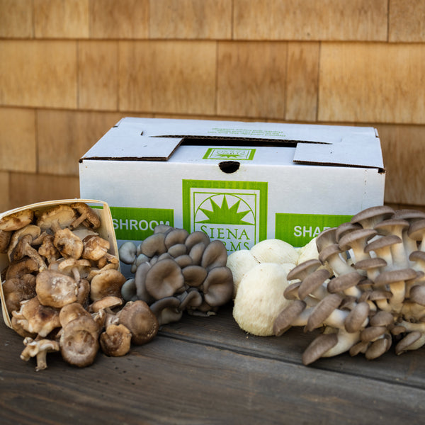 Mushroom production is a relatively new project for us here at Siena Farms, and so far it's been a whole lot of fun, with very delicious results! Simple controls of temperature, humidity, light and air exchange (like us, mushrooms breathe in oxygen and exhale CO2) have enabled a steady, year-round harvest of fresh mushrooms we can now offer to our CSA members. Currently we’re growing shiitake, blue oyster, black pearl oyster, and lion’s mane mushrooms — and we’re so happy to share them with you!